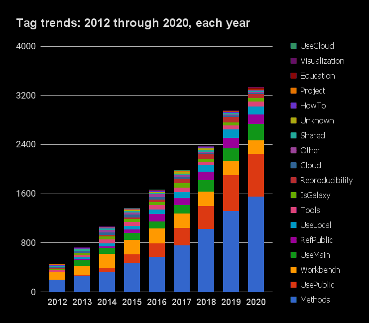 | Year | # Pubs | Methods | UsePublic | Workbench | UseMain | RefPublic | UseLocal | Tools | IsGalaxy | Reproducibility | Cloud | Other | Shared | Unknown | HowTo | Project | Education | Visualization | UseCloud | |