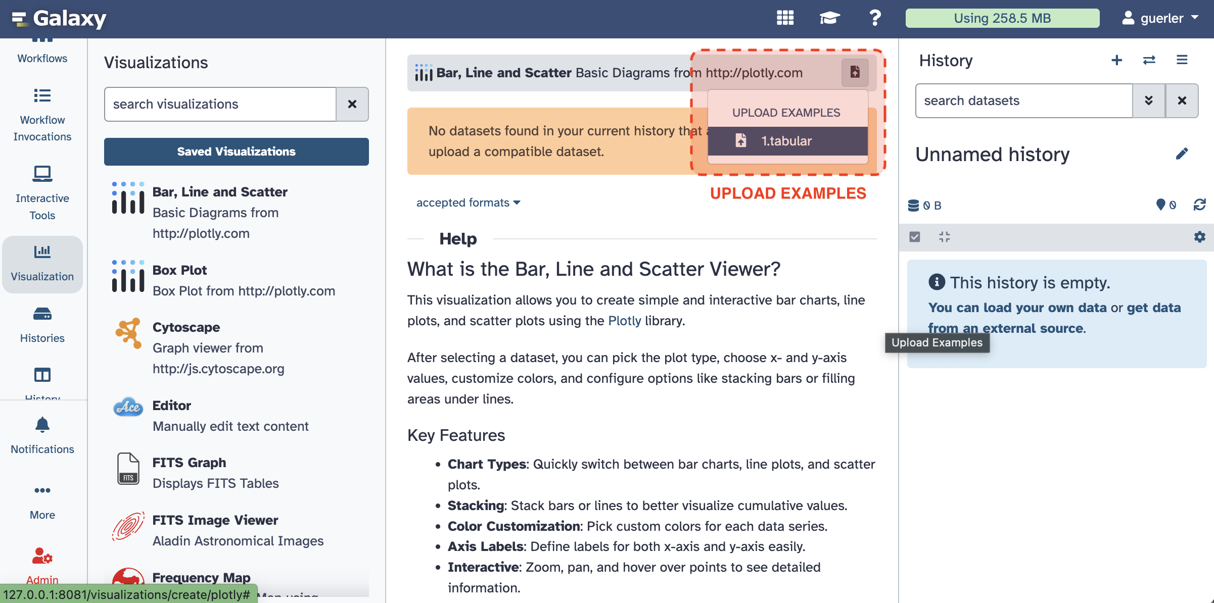 Galaxy Charts is Galaxy’s primary visualization framework for creating interactive, browser-based visualizations directly from Galaxy datasets. It supports seamless integration of third-party visualization plugins and includes a broad set of JavaScript-based visualizations, from standard charts such as bar, line, scatter, and pie to advanced viewers for molecules, proteins, networks, and phylogenetic trees.