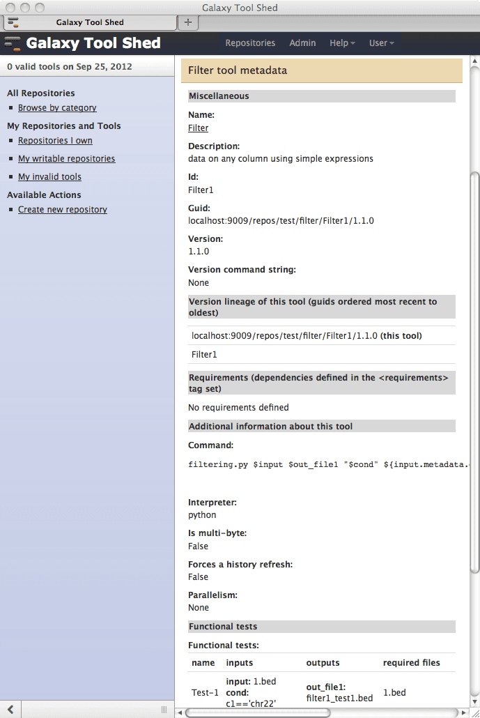 Selecting View tool metadata for our filter tool displays the following page. Notice that the metadata about the filter tool includes the tool id, version, guid, name, description, requirements and functional tests.