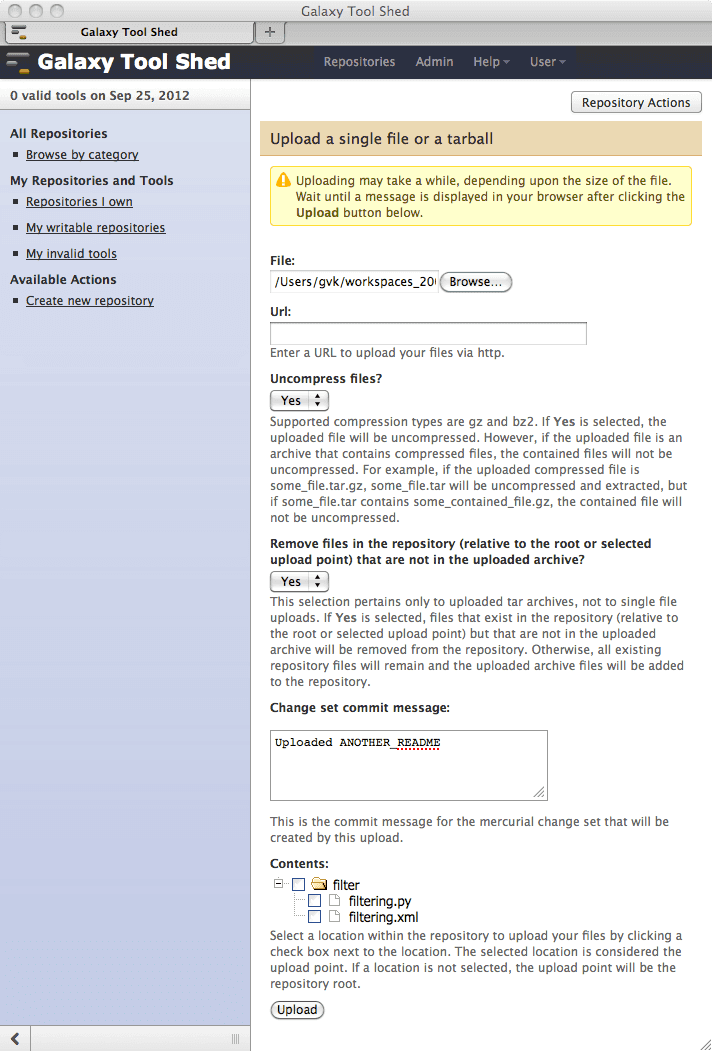 In this example, we’re uploading a tarball that include only the 2 filter tool files, filtering.xml and filtering.py. We don’t want to eliminate the text file we just uploaded, so we set the Remove files in the repository (relative to the root or selected upload point) that are not in the uploaded archive? select list to have the value No.