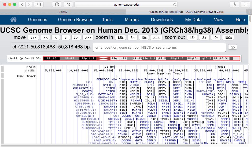Make sure that your settings are exactly the same as shown Fig. 6 (in particular, position should be set to “chr22”, output format should be set to “BED - browser extensible data”, and “Galaxy” should be checked within the Send output to option). Click get output and you will see the next screen: