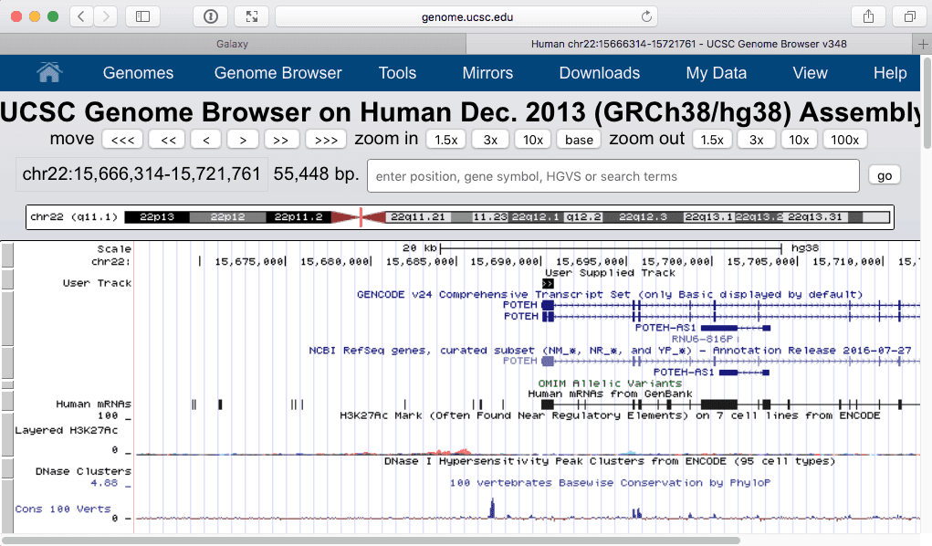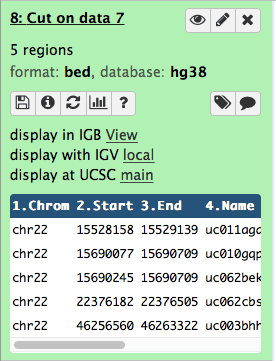 | Figure 8. The first dataset in the history (right pane) contains data about location of coding exons on chromosome 22. |