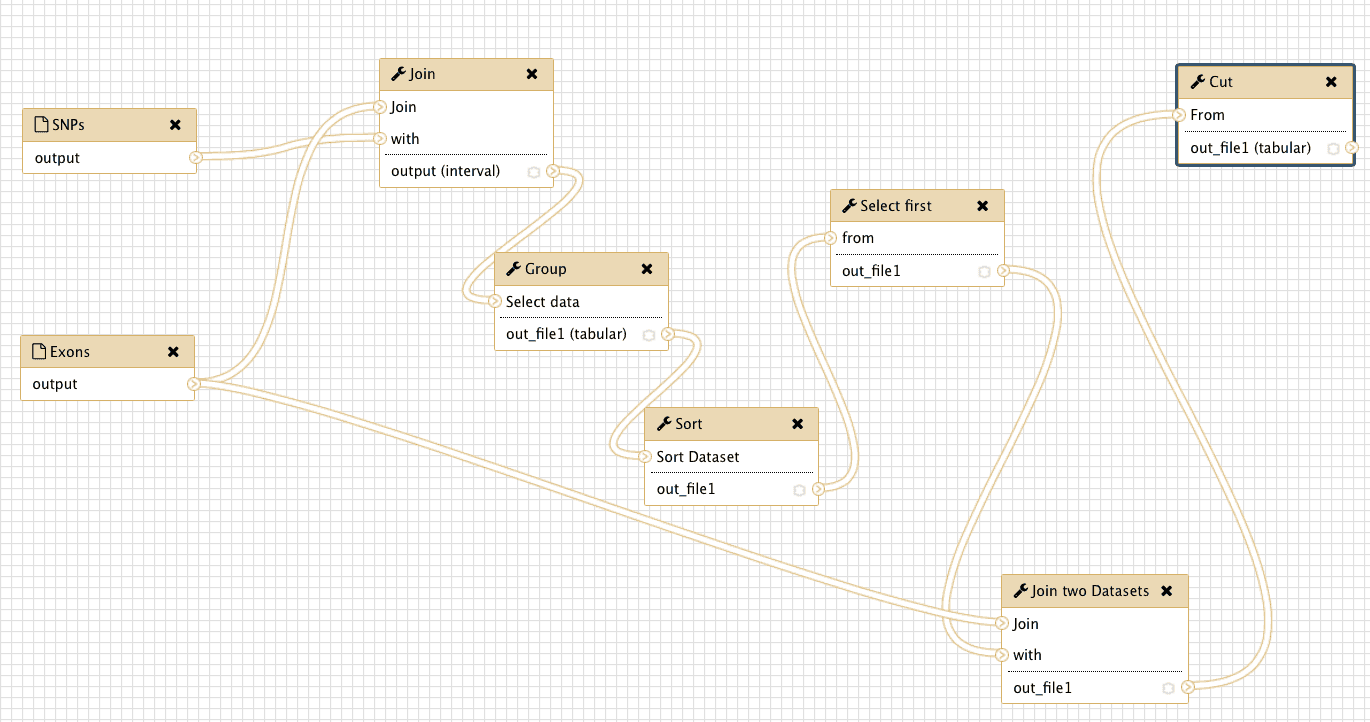 Once you do this the representation of the workflow in the bottom right corner of the editor will change with the last step becoming orange. This means that this is the only step, which will generate a dataset visible in the history: